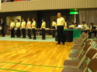 2階席が選手の控え室で、会場の三分の一程度が衝立で区切られ、練習場に割り当てられておりました。また、競技前および昼休みには競技スペースも練習場に解放されたため、選手の皆さんは練習が十分出来たようでした。 |