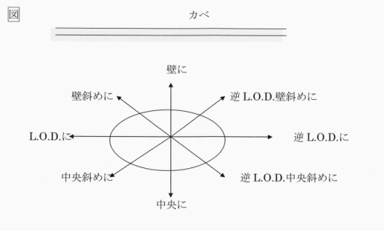 図を見て感じられたと思いますが、「壁斜めに面して」と「逆L.O.D.中央斜めに背面して」は表現が違うが足の向きが同じであることが理解できると思います。