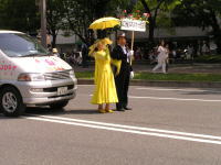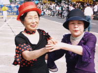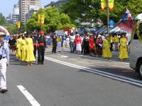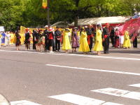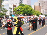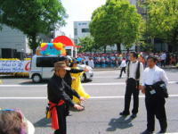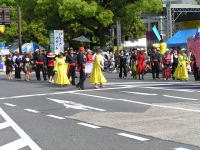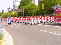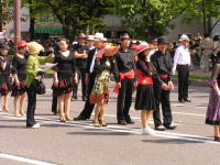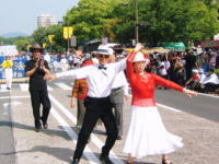 当初は「ダンス衣装を着て軽くダンスを踊り、又行進する」と案内しましたが、沿道の見物客から大変な拍手喝采をいただき、ダンスを踊らざるを得ない状態で結局軽くどころか真剣にダンスを踊りました。道路上でのダンスで足首などを痛めることもなく、全員で踊り通しました。