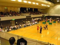2階席が選手の控え室で、会場の三分の一程度が衝立で区切られ、練習場に割り当てられておりました。また、競技前および昼休みには競技スペースも練習場に解放されたため、選手の皆さんは練習が十分出来たようでした。 |