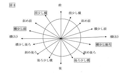 「足の位置とは、一方の足の位置に対する他方の足の位置のことである。」ということです。例えば「左足横」といえば、右足の位置に対する左足の位置が(右足の)横ということです。足の位置は「前・後」「横(左右)」「横(左右)少し前」「横(左右)少し後ろ」「前少し横(左右)」「後ろ少し横(左右)」「斜め前(左右)」「斜め後(左右)」の16通りあります。(図3)