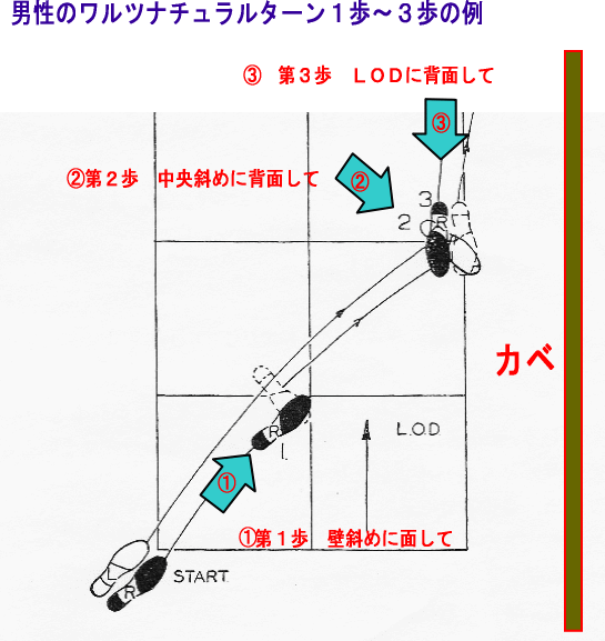 男性 第1歩目 壁斜めに(面して)右足前進(=右足のつま先が壁斜めに向いて前進)、 第2歩目 中央斜めに背面して左足横(=左足の踵が中央斜めに向いて左足横)、 第3歩目 L.O.D.に背面して右足を左足に揃える(=右足の踵をL.O.D.に向けて左足に揃える)
