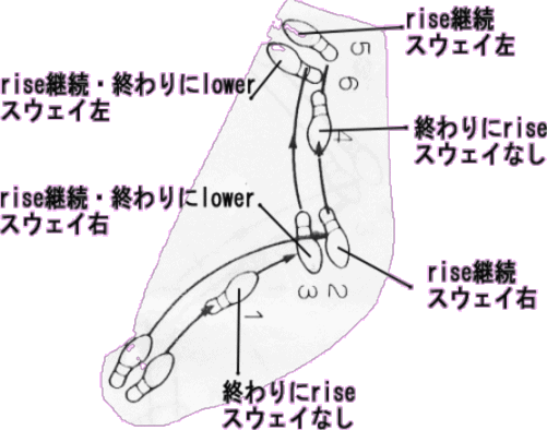 1の終わりに少しrise(N.F.R.)、 2でriseを継続、 3でupそし て3の終わりにlower、 (4〜6はriseなし)